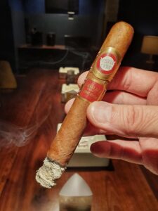 Im letzten Drittel gewinnt die Zigarre leicht an Intensität, ohne ihren mittelkräftigen Charakter zu verlassen. Der Rauch ist dicht und cremig und neue Nuancen wie feine Muskat- und Vanillenoten treten hinzu, dezent, elegant und gut eingebunden. Die Erde wirkt dunkler, das Holz kräftiger, und die Würze bleibt präsent, ohne zu scharf oder dominant zu werden. Insgesamt zeigt sich hier die Domaine Rouge von ihrer geschlossensten Seit: stabil, aromatisch vielschichtig und sehr harmonisch.